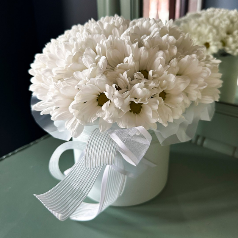 Небольшая композиция с белым хризантемами, похожими на ромашки